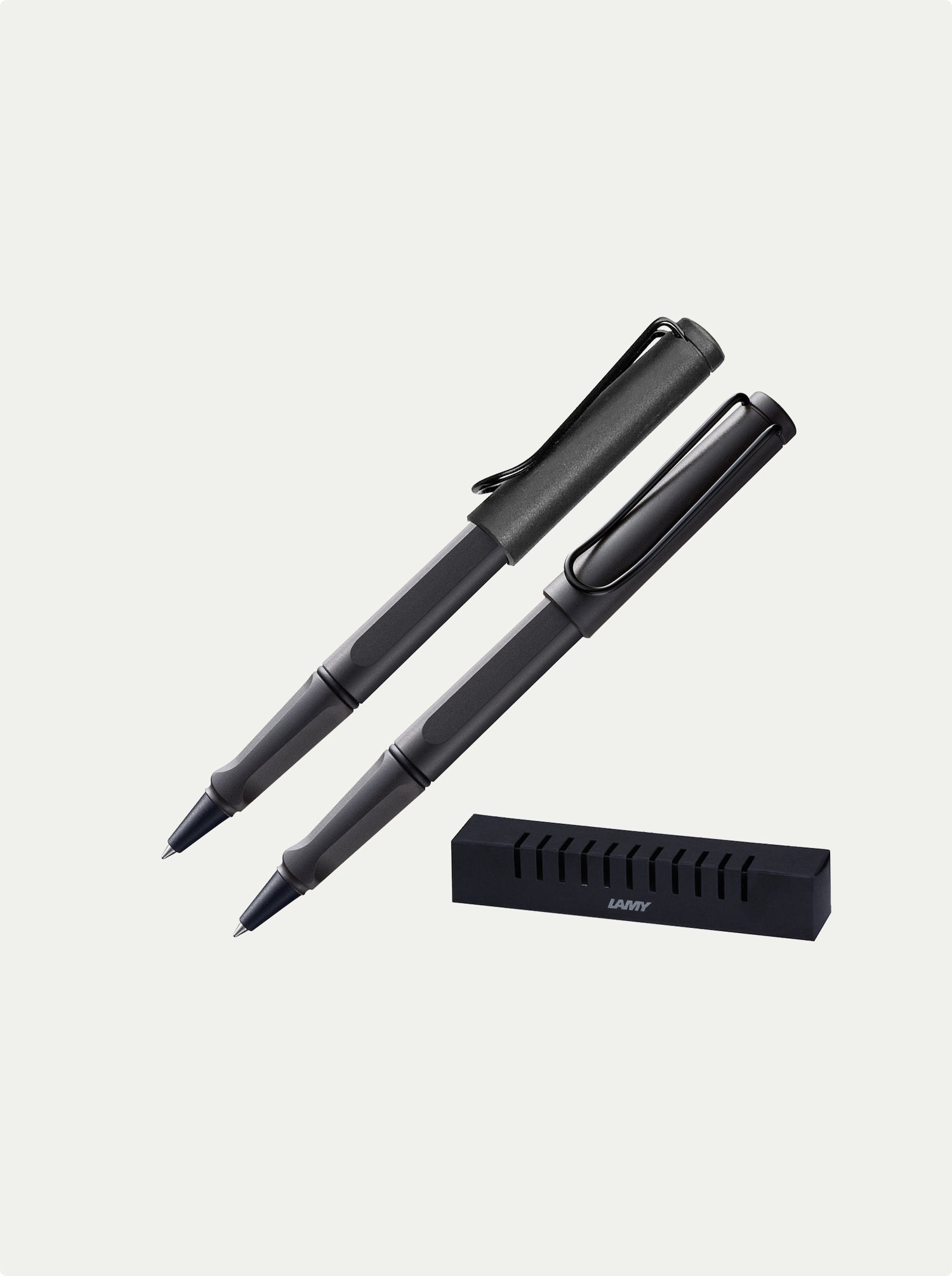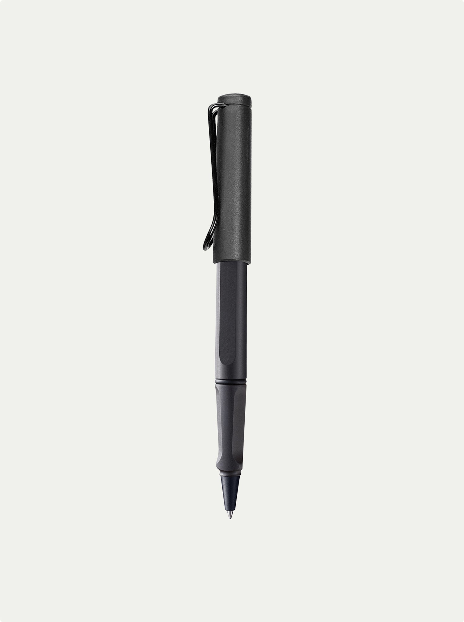 LAMY safari is a cap-off rollerball pen in sturdy plastic with ergonomically-shaped grip zone, faceted barrel and black clip