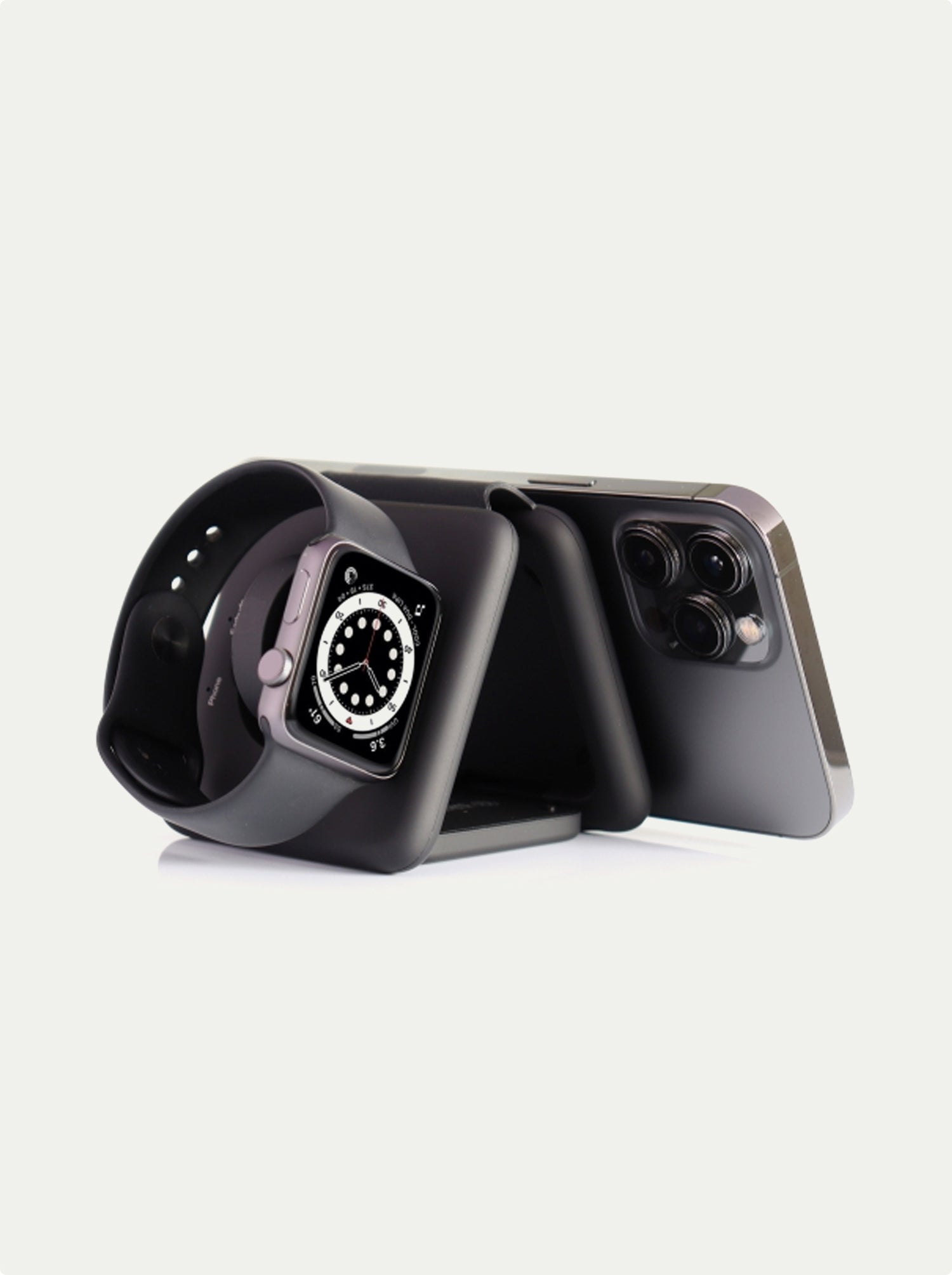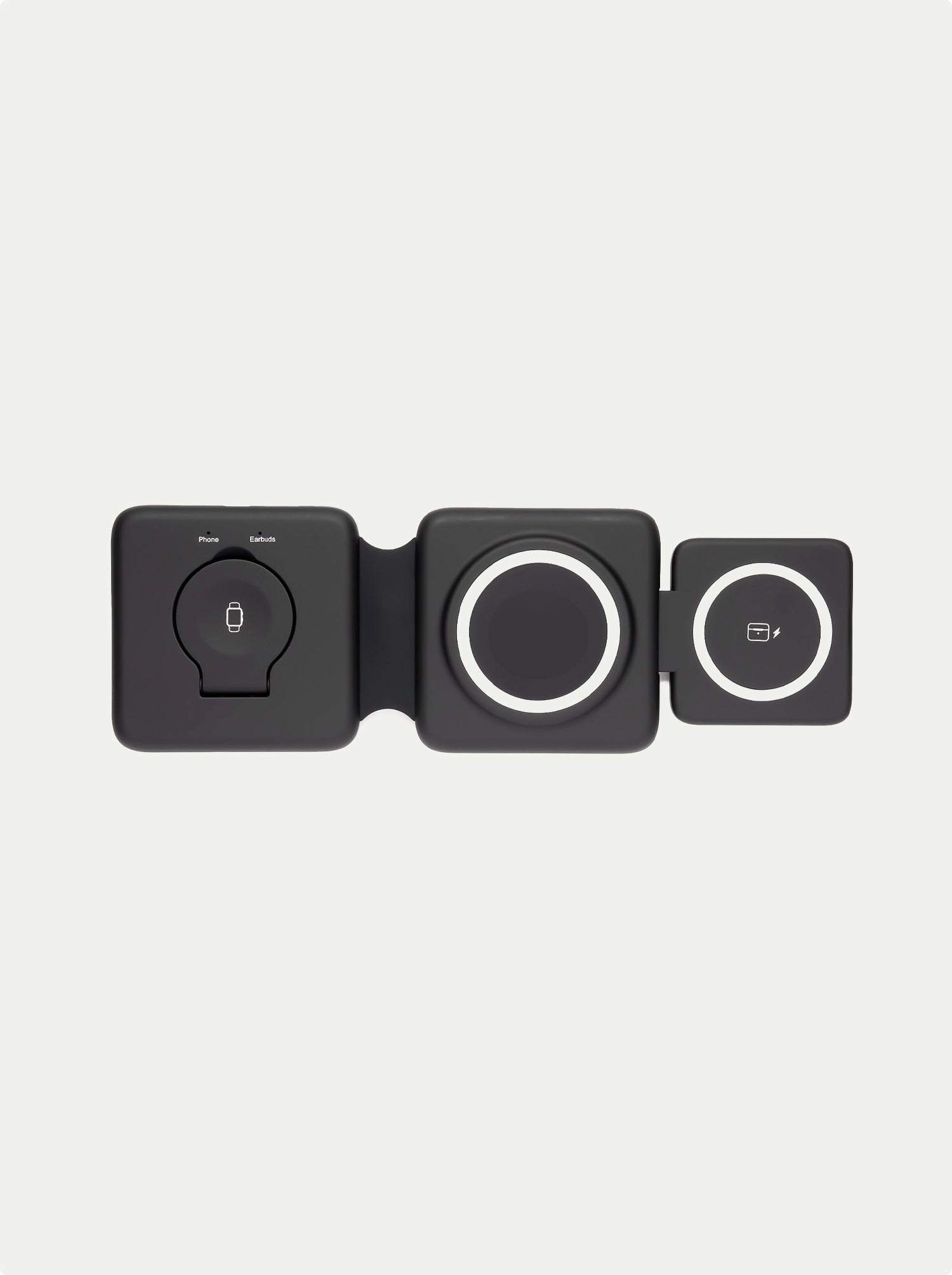 Say goodbye to bulky chargers and hello to our new dual folding MagSafe travel charging station. Featuring a unique, single fold design, this charger easily slips into your pocket or bag, making it the perfect travel companion. The wireless magnetic phone charger can reach speeds of up to 15 watts and securely holds a phone in place; and the earbuds and apple watch charger complete the package by seamlessly folding in and out as needed.