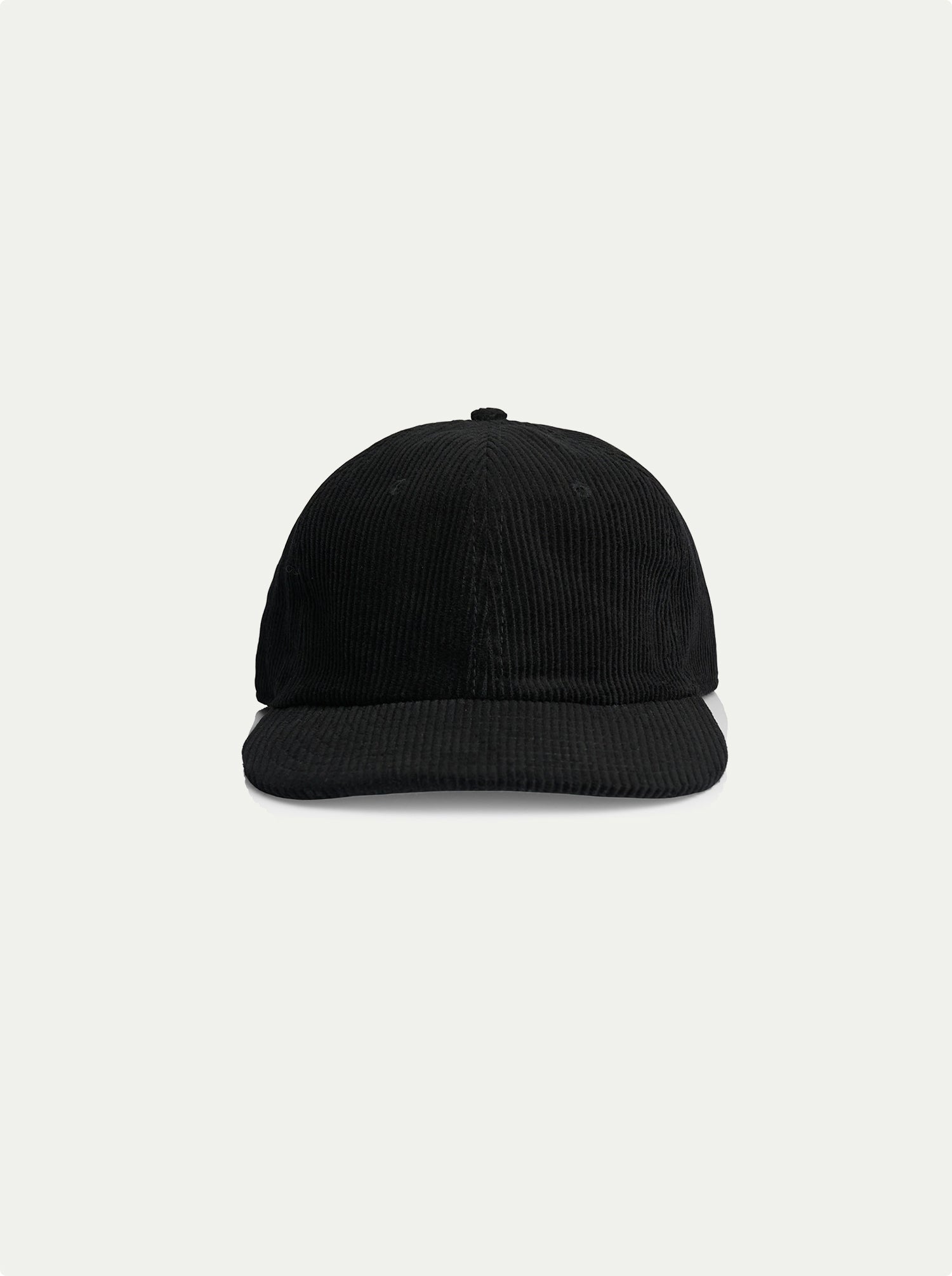 Details: Mid profile - unstructured six panel cap, flat peak Mid weight 100% cotton, 8-wale partridge cord Adjustable fastener with metal clasp, tonal under-peak lining One size fits all